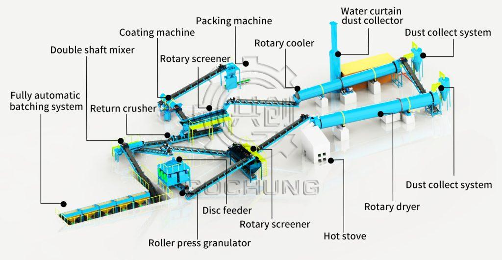 The process flow of compound fertilizer double-roller granulation production line can usually be divided into: raw material batching, raw material mixing, raw material granulation, particle drying, particle cooling, particle classification, finished product coating, and final finished product packaging.