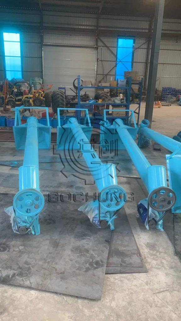 The screw conveyor mainly includes spiral blades , machine grooves , hangers , feeding and discharging ports , transmission devices and other parts. lt is used to transport powdery or small pieces ofmaterials .
